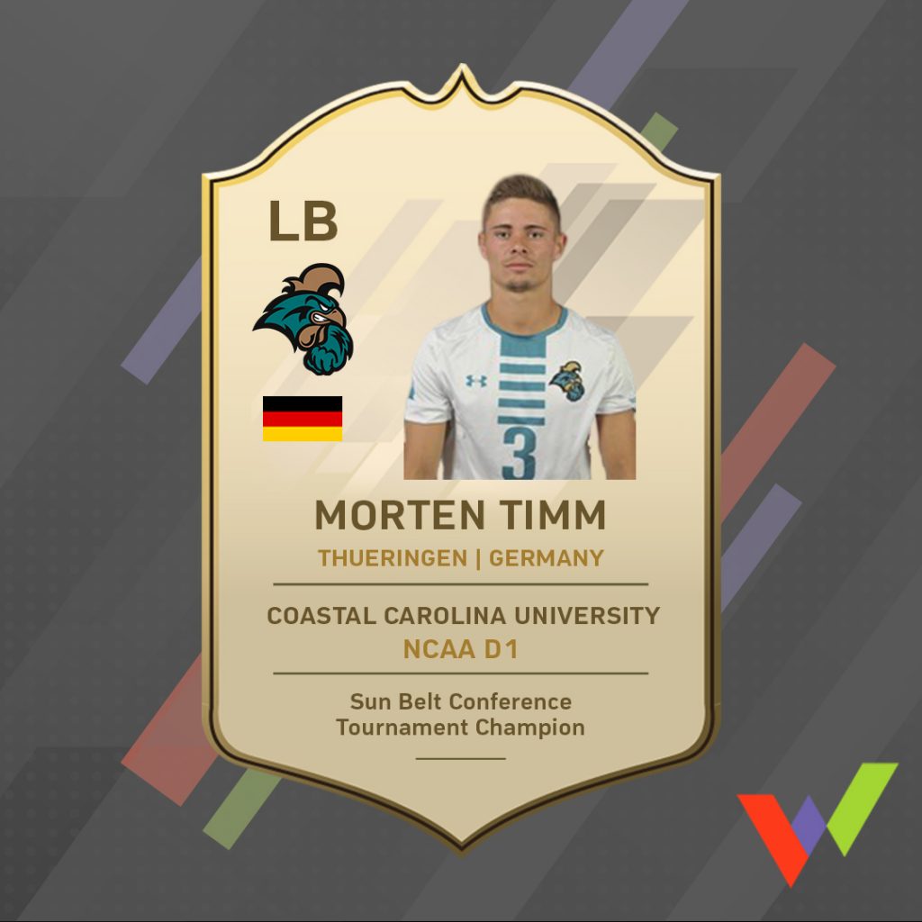 Vor fast vier Jahren hat sich Morten aus Thüringen, Deutschland auf den Weg in die USA gemacht. In seiner ersten Saison spielte er noch für die University of South Carolina Upstate (USC Upstate), bevor er für drei weitere Jahre zur CCU wechselte. Derzeit befindet er sich in seinem letzten Semester vor dem Abschluss eines Bachelor-Studiums. Im vergangenen Jahr erreichte Morten mit seinem Team die zweite Runde des NCAA D1 National Tournament und wurde Meister des Sun Belt Conference Tournament.