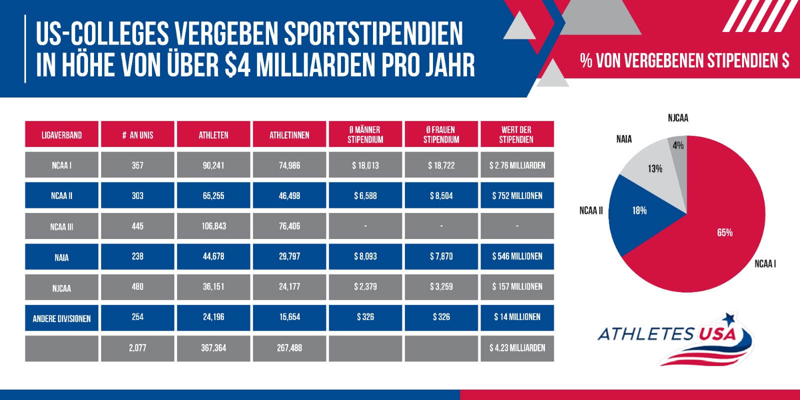 - Es gibt über 2,000 Colleges in den USA mit Sportprogrammen. Insgesamt investieren diese Colleges pro Jahr über 4,2 Milliarden US-Dollar in Sportstipendien.